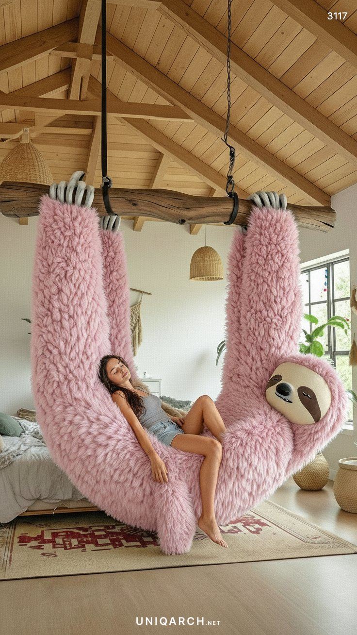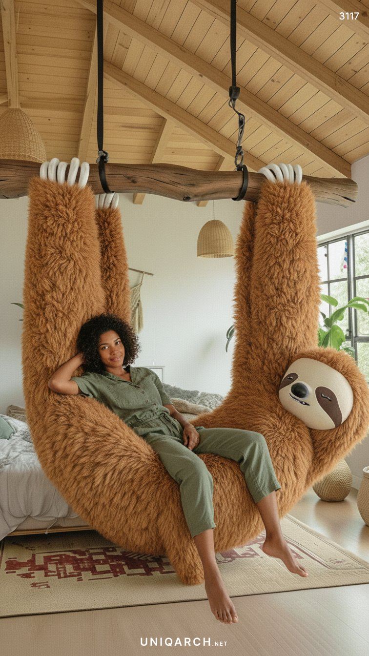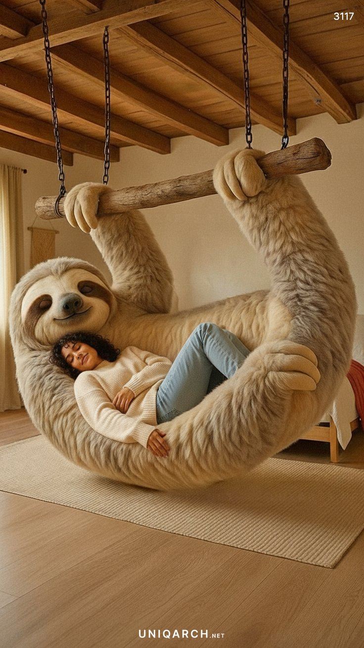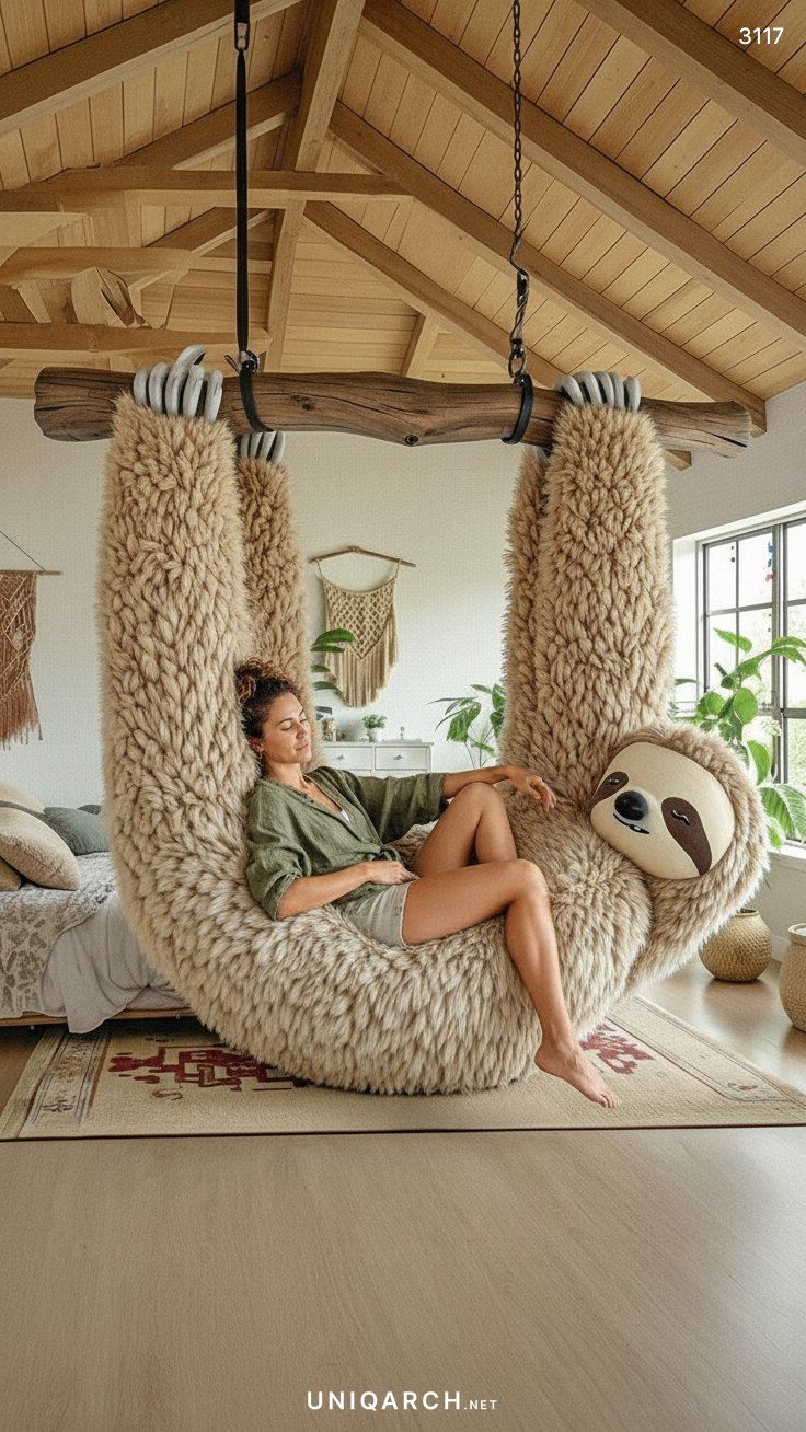 A Hanging Sloth Lounger acts as a powerful statement piece. In a living room dominated by standard sofas and armchairs, the presence of a giant, hanging sloth immediately draws the eye and sparks conversation. It breaks the monotony of conventional furniture layouts and injects a sense of personality and whimsy into the space. It signals to guests that this is a home where comfort and fun are prioritized.